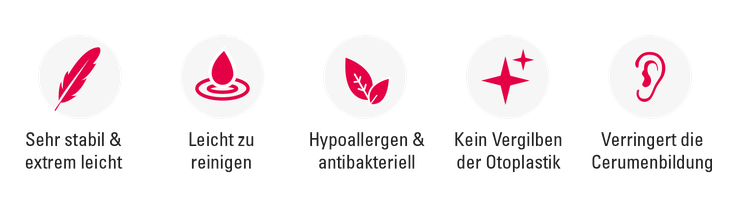 Keramik Otoplastiken bieten nicht nur eine angenehme Haptik, sondern zeichnen sich auch durch ihre thermische Beständigkeit aus–sie behalten die Körpertemperatur länger bei und fühlen sich dadurch nicht unangenehm kalt an. Ihre außergewöhnliche Festigkeit und die hohe Resistenz gegenüber Reinigungsmitteln, Chemikalien und Temperaturveränderungen übersteigen die Eigenschaften herkömmlicher Kunststoff-Otoplastiken bei Weitem. Keramik ist allgemein sehr bioverträglich und hypoallergen, sehr robust, langlebig, pflegeleicht und wird den höchsten ästhetischen Ansprüchen gerecht.