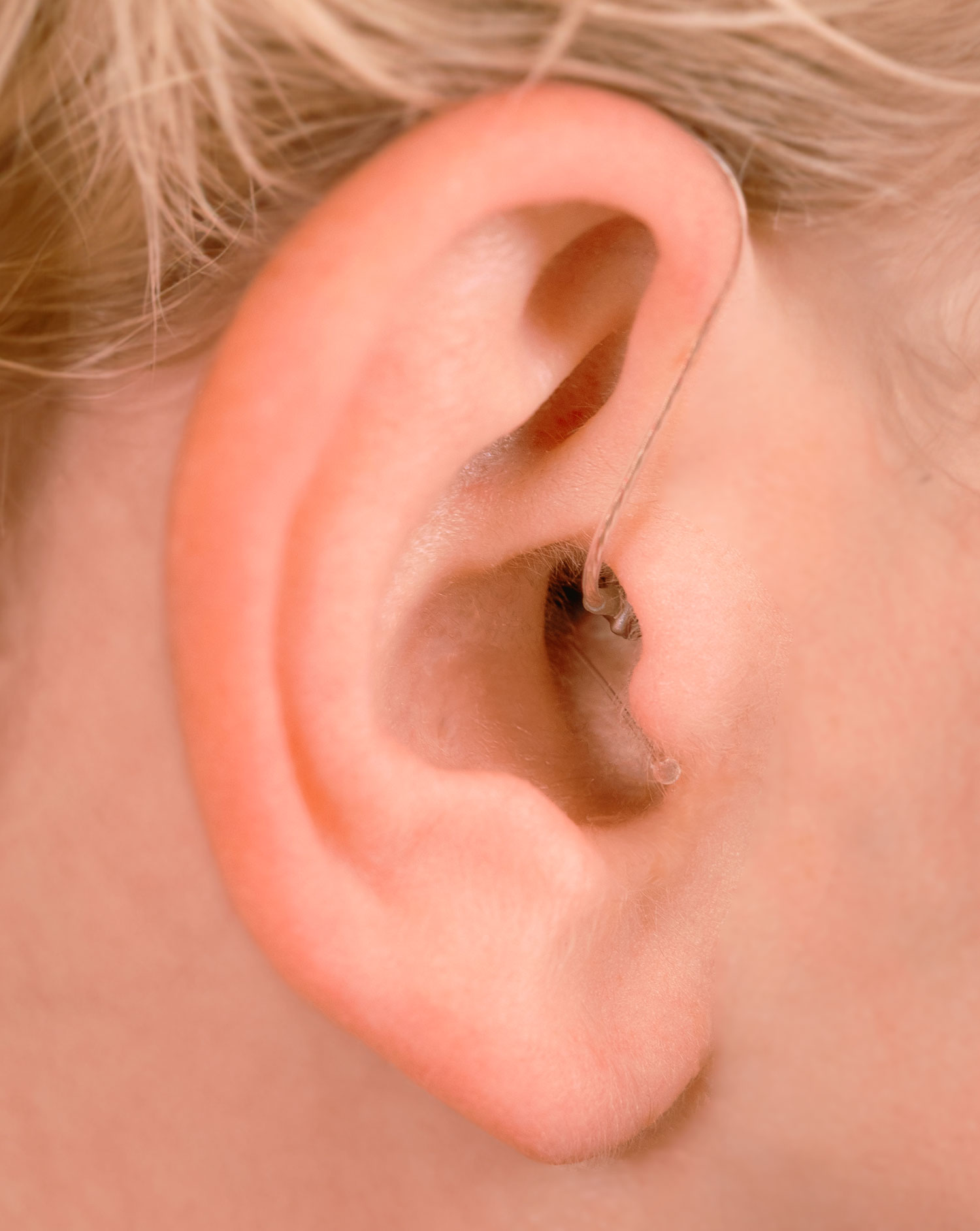Hinter dem Ohr Hörgeräte sind sehr diskret und bestehen aus zwei Teilen: einem Ohrpassstück (Otoplastik), das direkt im Ohr vor dem Trommelfell sitzt, und einem Hörgerät das hinter der Ohrmuschel liegt und über einen transparenten Schallschlauch verbunden ist.